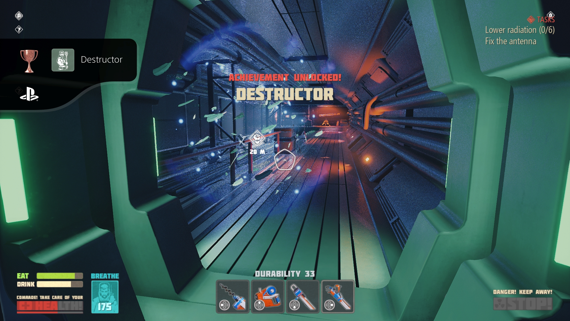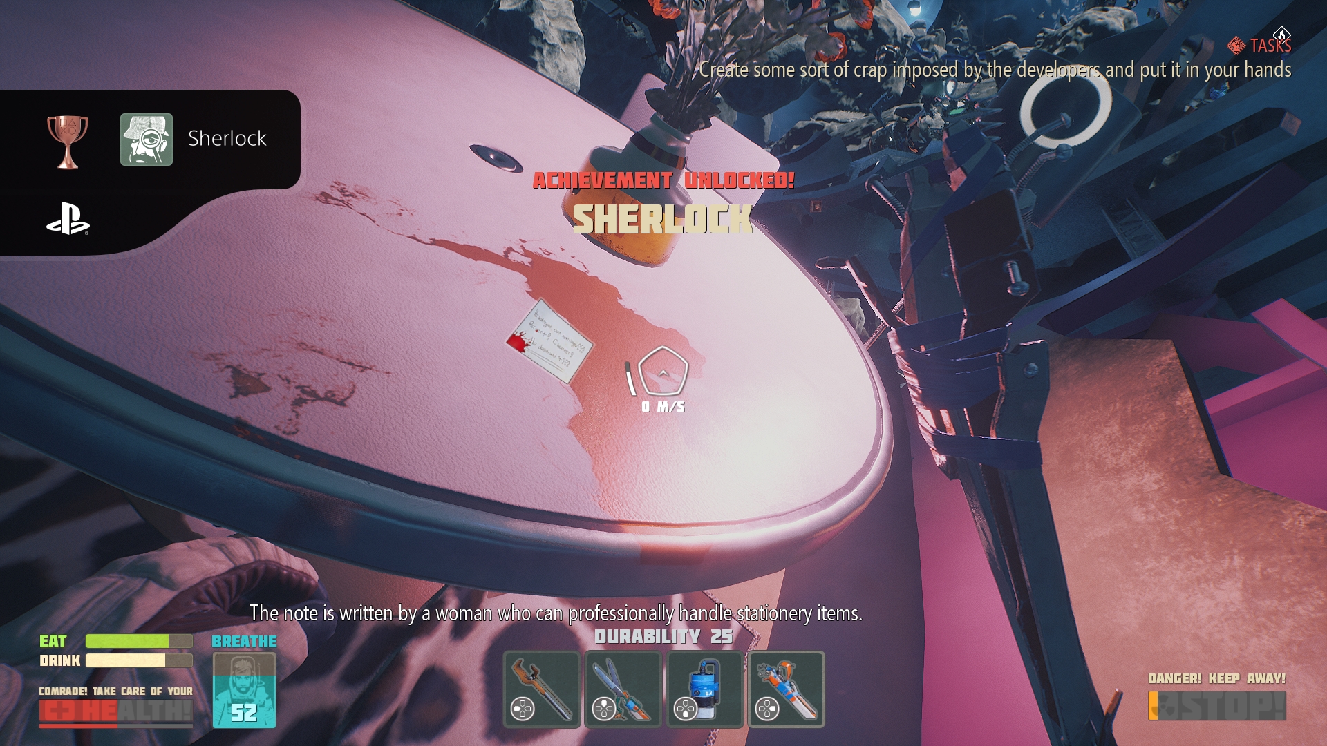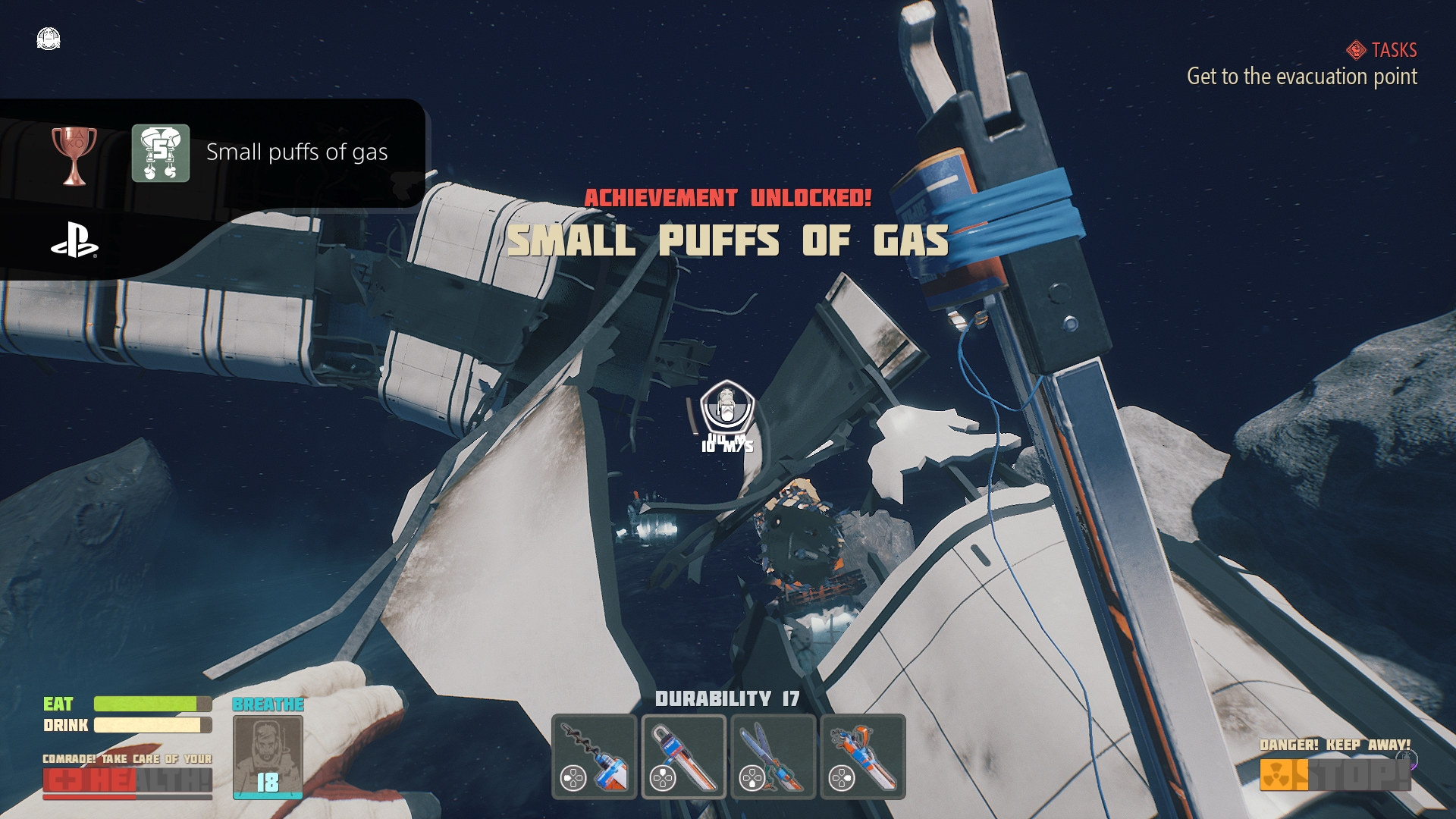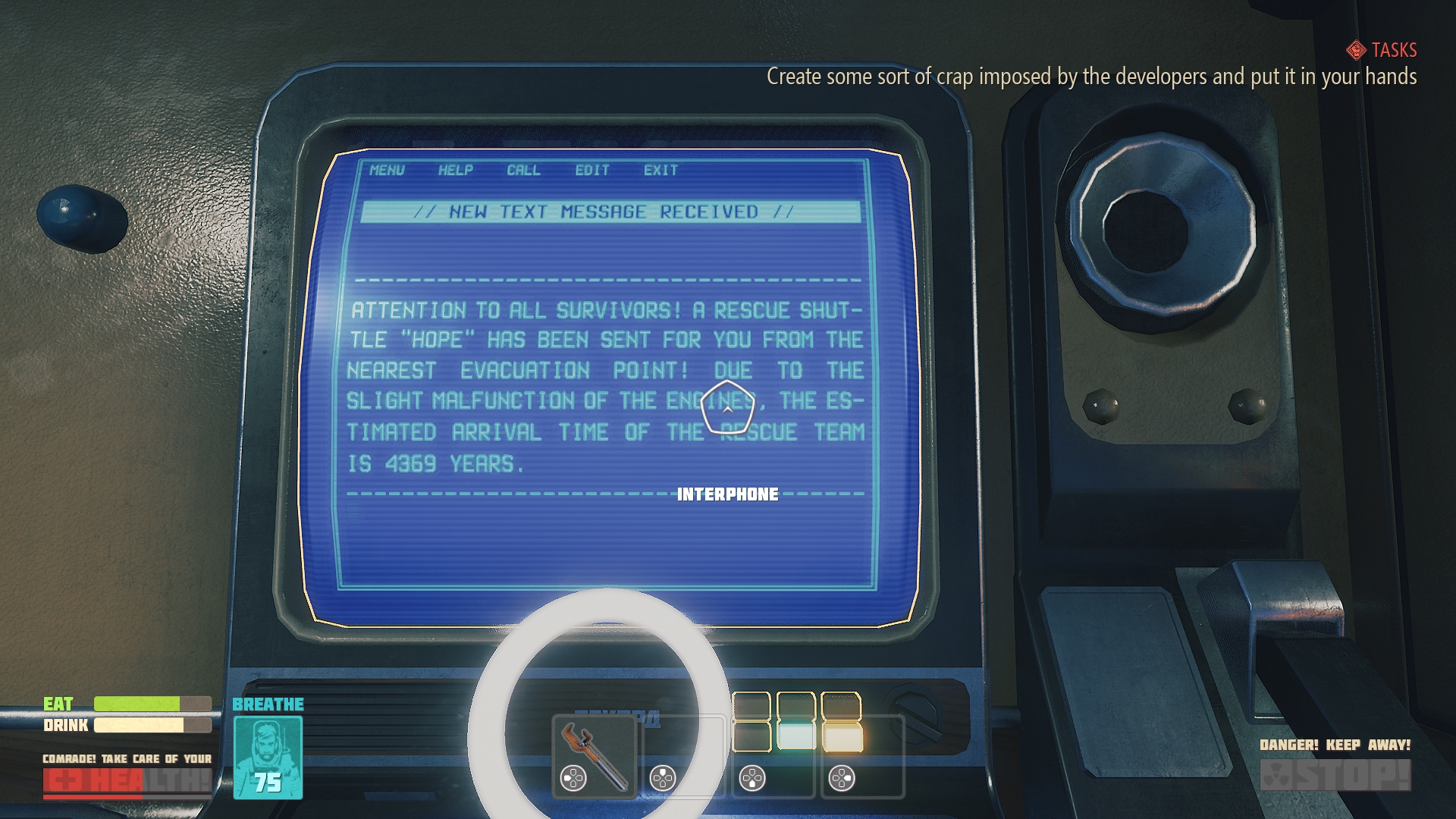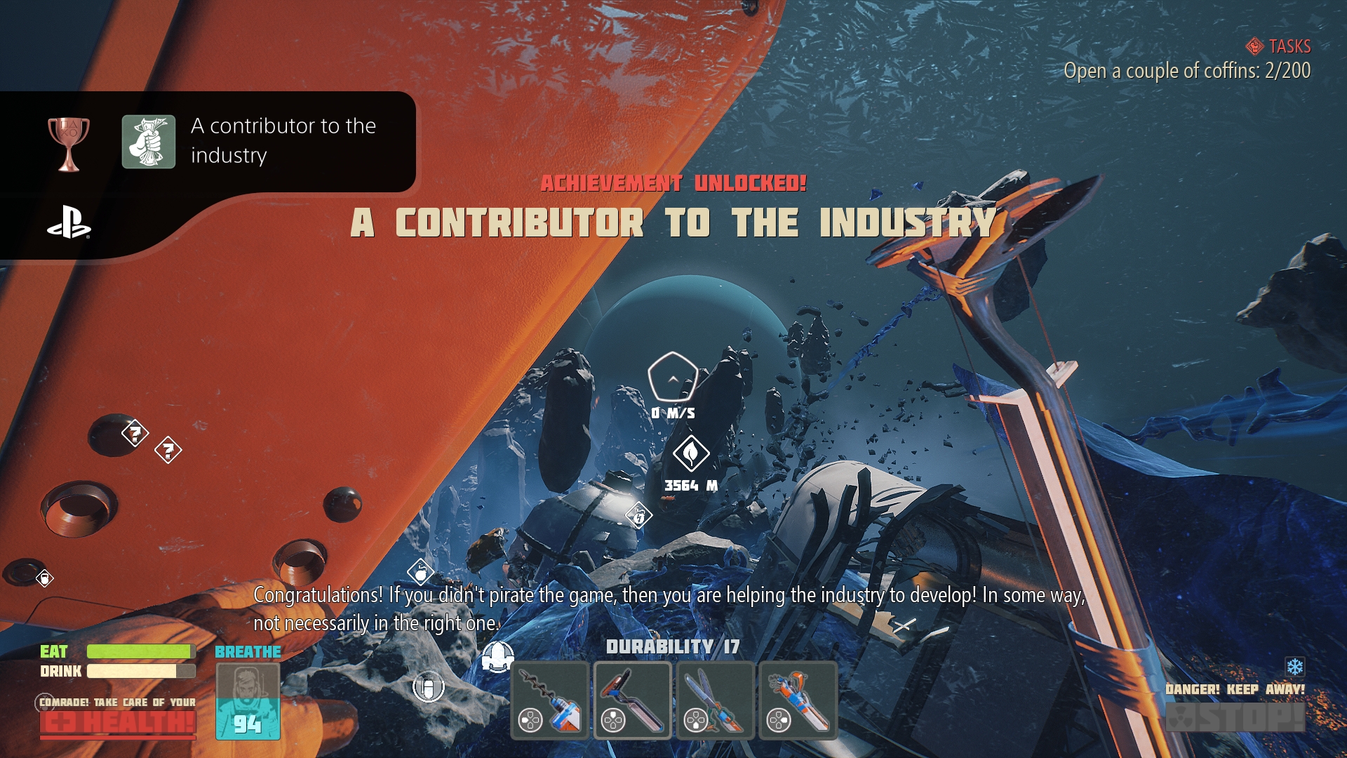 As with most survival games, expect to do a lot of resource collecting in Breathedge. Debris is scattered throughout the game, ranging from generic substances like ice and metal, to more specific things like batteries, resin, titanium, rubber, manure, and condoms. Thinking about sex in space is probably something most people don’t do too much, but the deviants at RedRuins apparently thought about this, a lot. A voiceless character named “Babe” shows up on the player’s communication device early on in the game, and they have an avatar that is nothing more than a random woman’s ample cleavage. She mentions that she wants you to come rescue her, and while she does point out places of interest throughout the game, she also seems to want you to die in gruesome ways. It’s a funny way to progress things along, but it may also give the player reason to not go to some points of interest out of fear of dying.