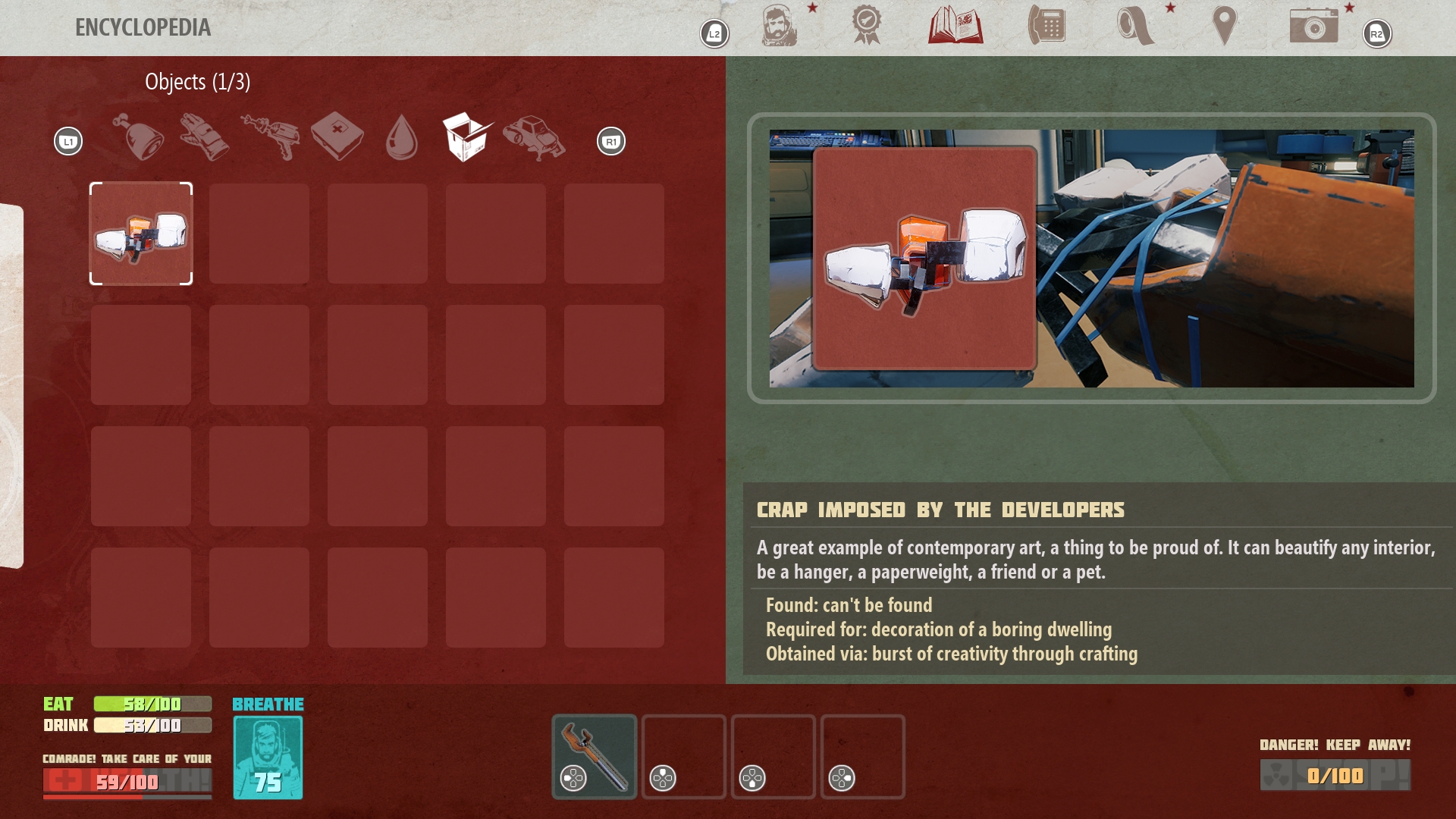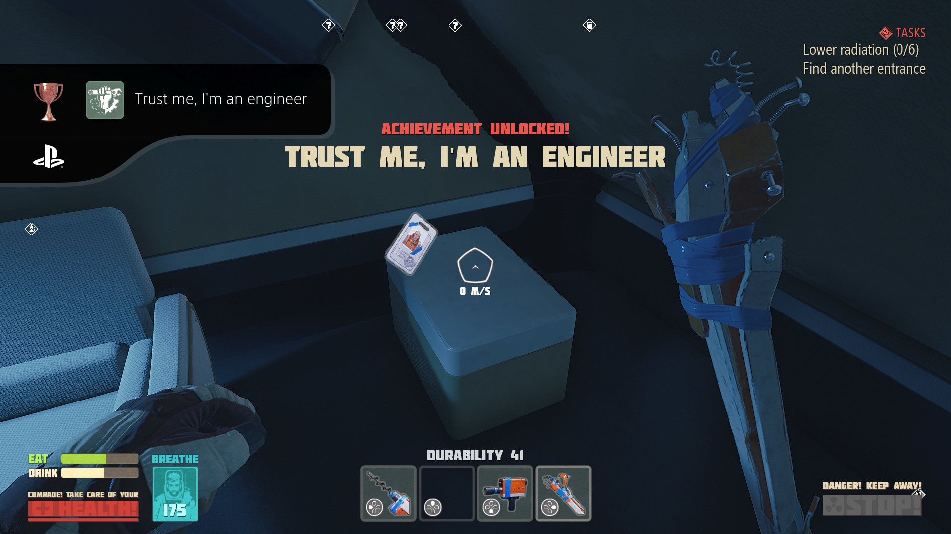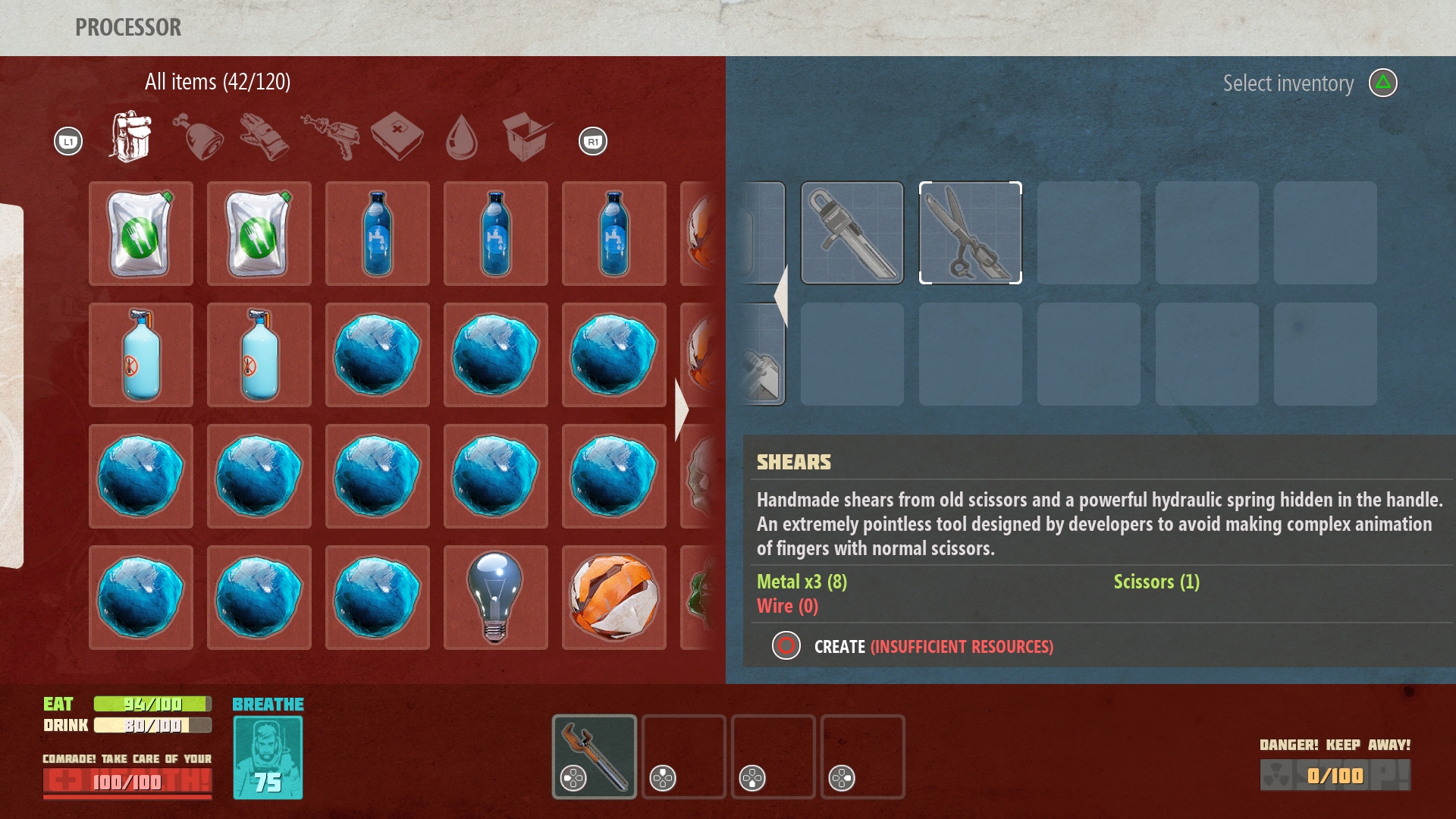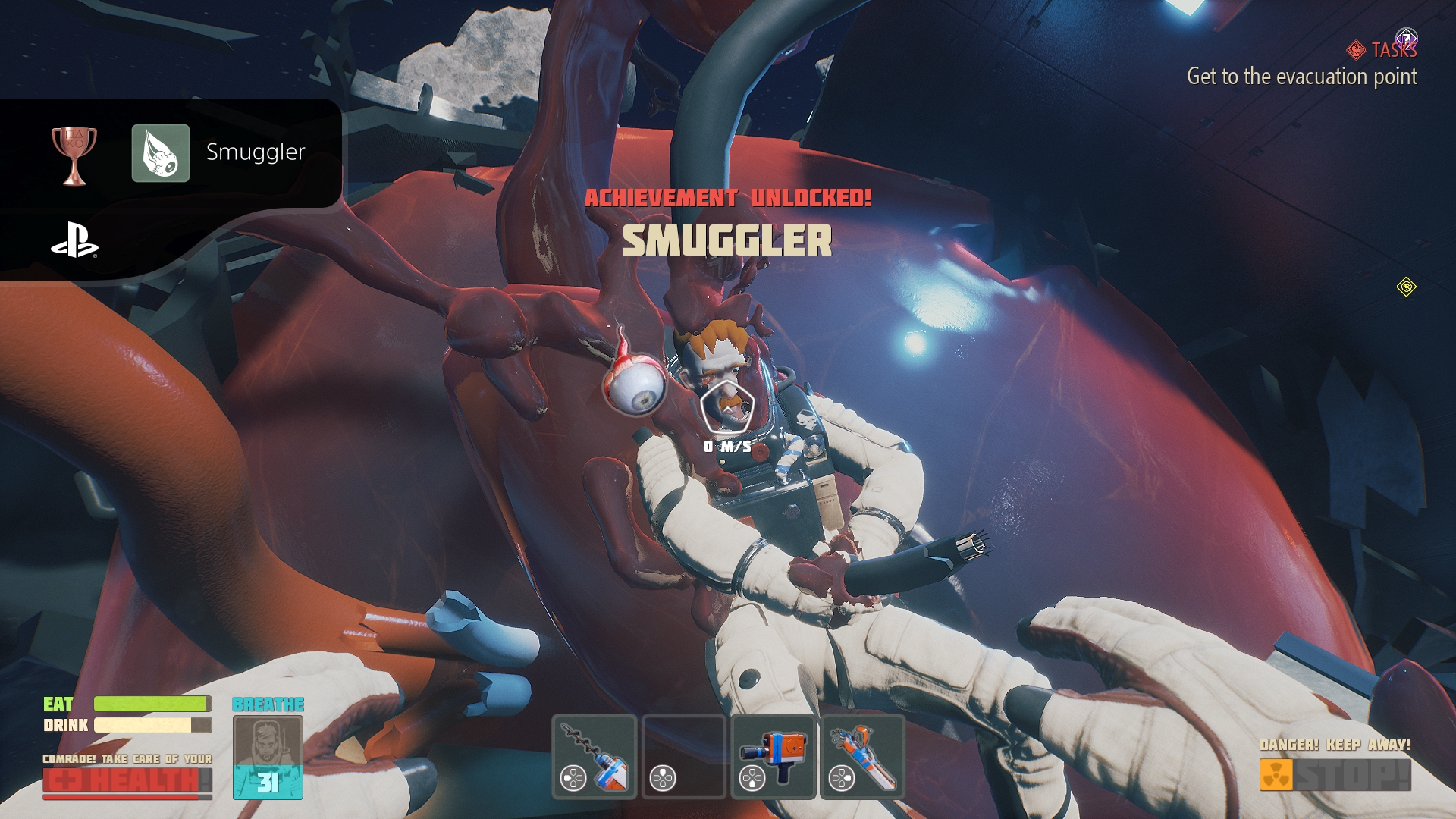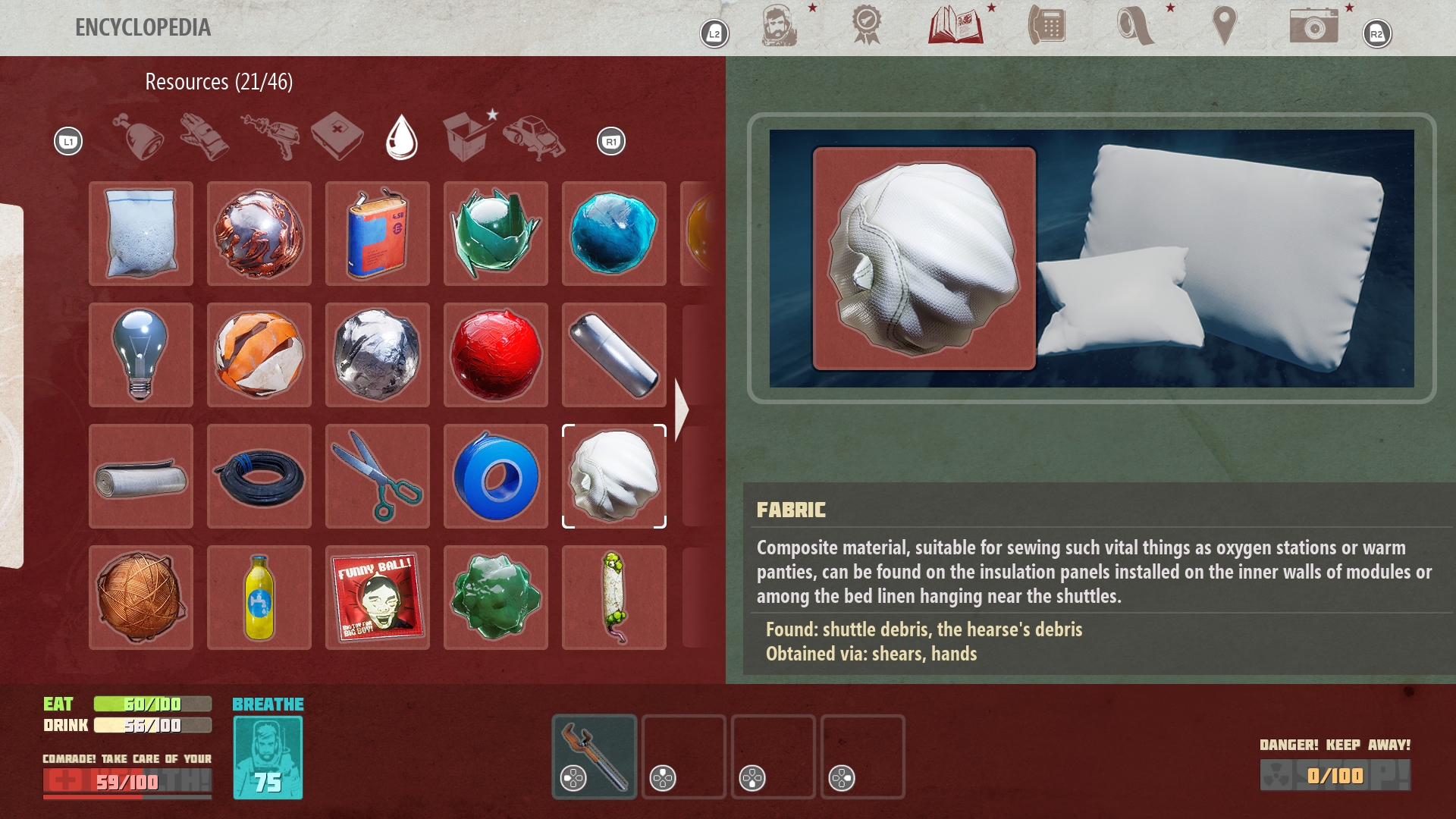 As with most survival games, expect to do a lot of resource collecting in Breathedge. Debris is scattered throughout the game, ranging from generic substances like ice and metal, to more specific things like batteries, resin, titanium, rubber, manure, and condoms. Thinking about sex in space is probably something most people don’t do too much, but the deviants at RedRuins apparently thought about this, a lot. A voiceless character named “Babe” shows up on the player’s communication device early on in the game, and they have an avatar that is nothing more than a random woman’s ample cleavage. She mentions that she wants you to come rescue her, and while she does point out places of interest throughout the game, she also seems to want you to die in gruesome ways. It’s a funny way to progress things along, but it may also give the player reason to not go to some points of interest out of fear of dying.