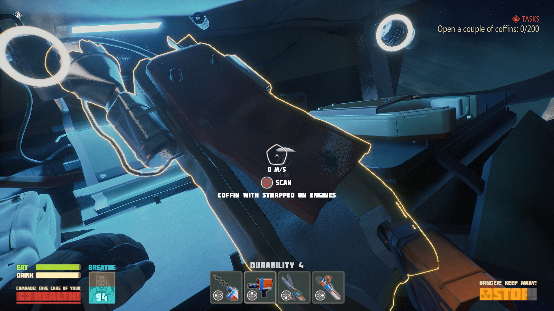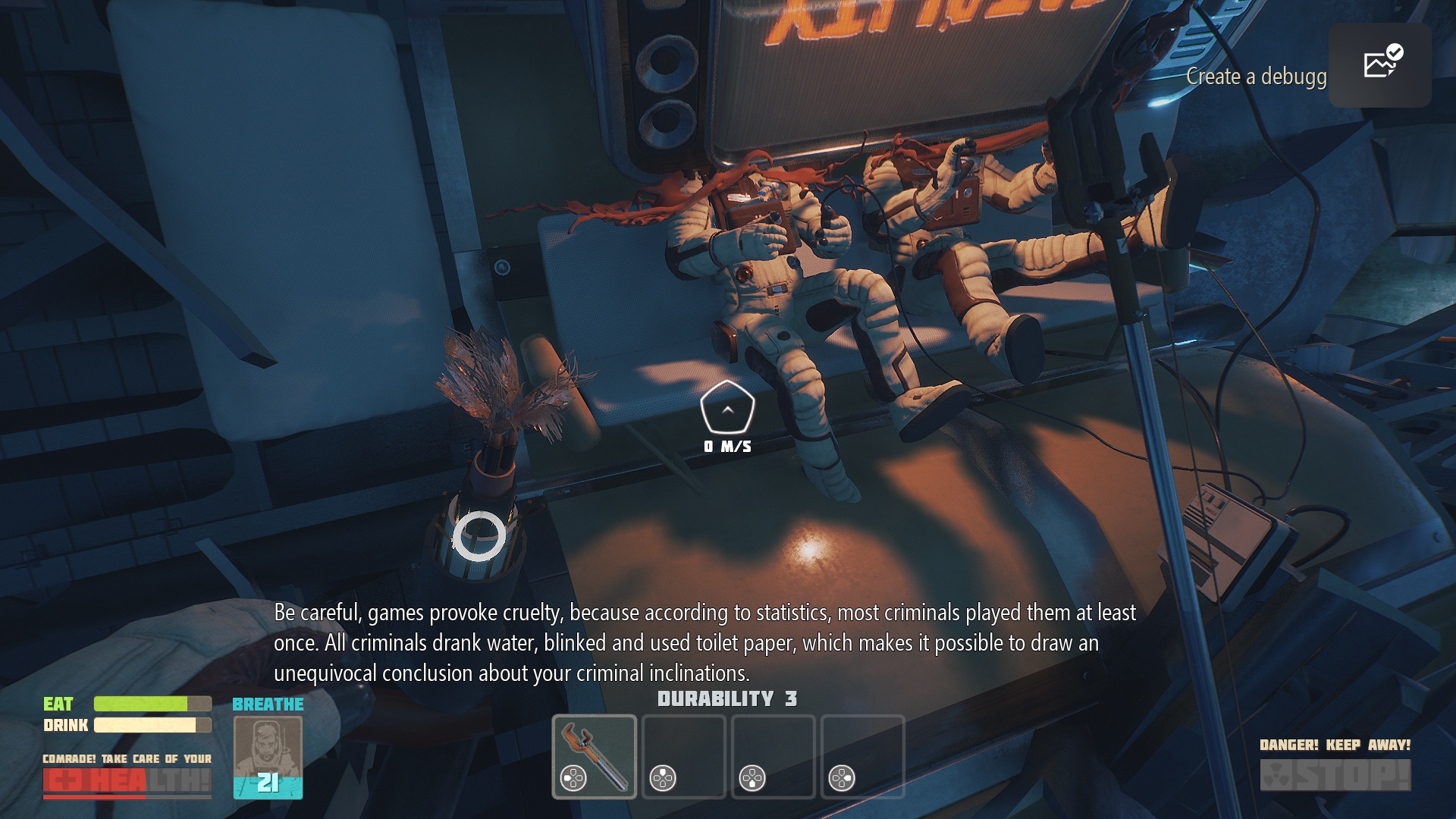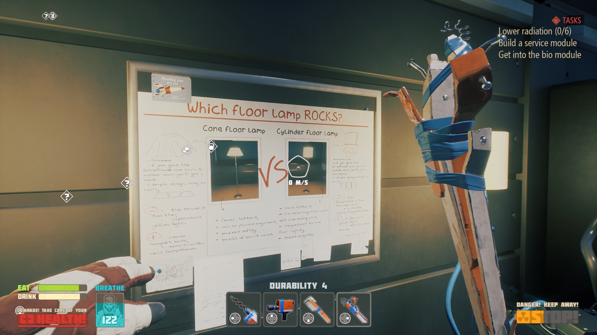 Do you like death? Weird question, but Breathedge features a lot of death. Not necessarily of the player, though that can easily occur with one badly timed trip outside of a compartment by running out of oxygen. But the space liner that crashed in the beginning of the game apparently had a lot of souls onboard, and many other people died as they lived out their last moments. Breathedge takes a lot of liberties with gravity for this setup, but the result is worth seeing just for the absurdity of it all.