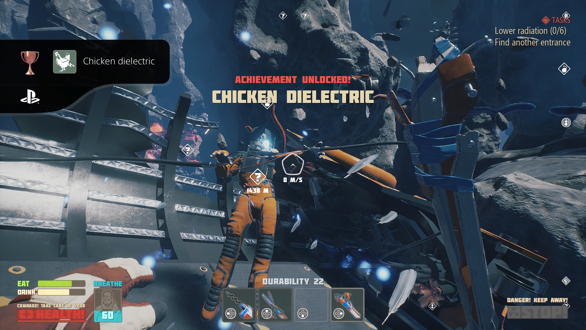 When Breathedge is first booted up, the game shows its controls, and then tasks the player with plugging a leak—leaks are no good in space. One of the buttons, square, is mapped to “fly.” But this isn’t fly as in fly around in space, this is fly as in the zipper on your pants. Pressing it causes the player to urinate on whatever is in front of them. If this is done in the cold vacuum of space, it can quickly lead to the player freezing to death. Urinating on electricity is also not recommended. An immortal chicken is always in the player’s left hand, and can be used as a tool in many different situations. Right off the bat, Breathedge lets you know that it doesn’t take itself too seriously.
