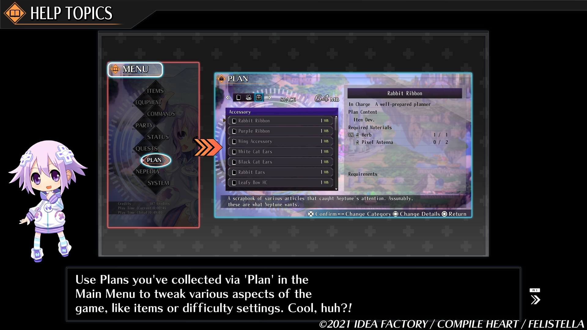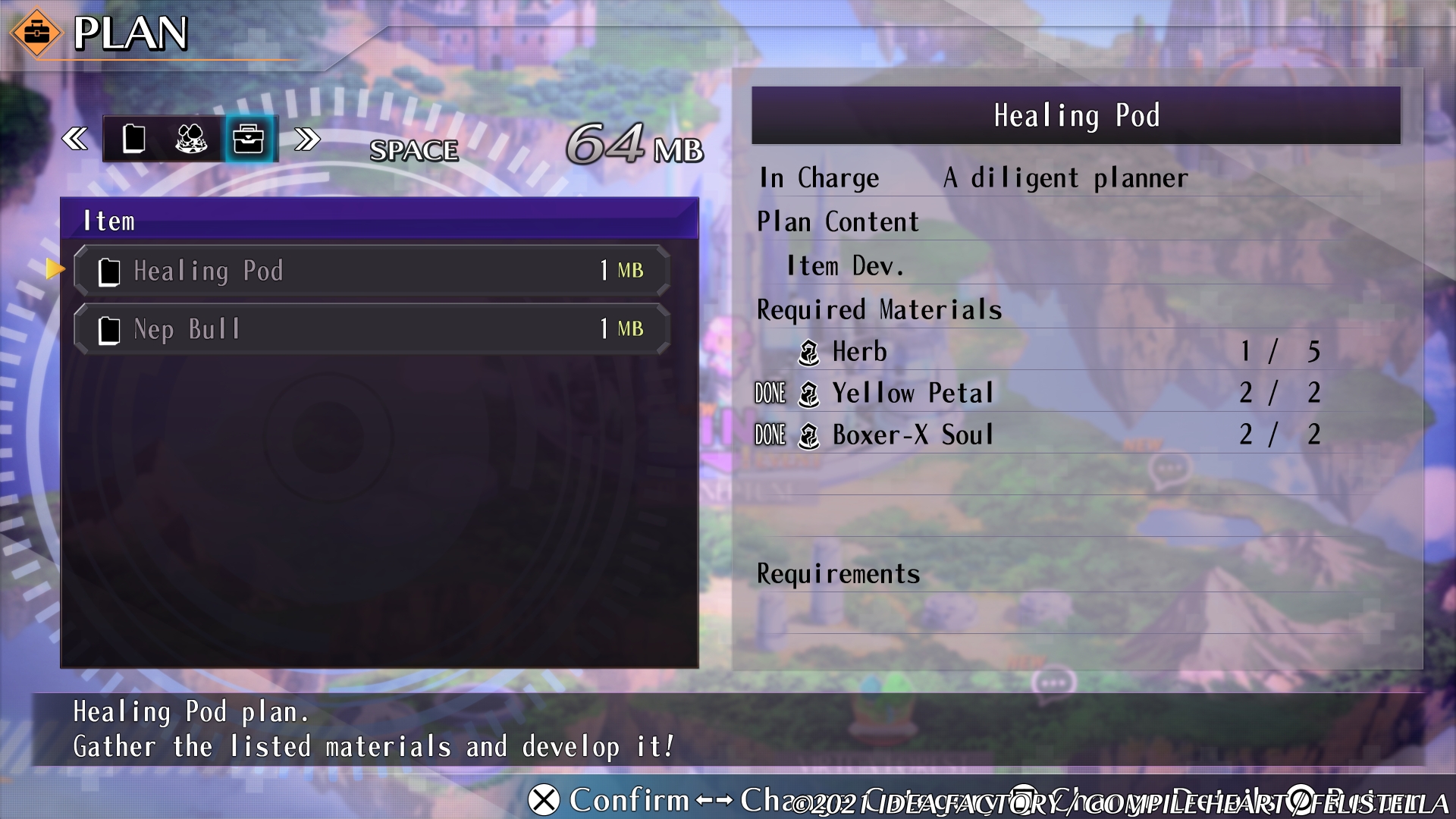 Between fights and cutscenes, the player can move freely in an overworld map, which contains points of interest including a shop, random dungeons, and the aforementioned fishing minigame. Accessing the menu reveals a “Plans” entry, which allows players to load up plans that they find from fights or receive from characters or missions. These plans cost a certain number of various ingredients to craft, and they each have a memory cost from 1 to dozens of MBs (that’s Megabytes for the youngest of you who’ve grown up only knowing GBs of RAM on your smartphones and consoles). Each plan can alter the game’s behavior in some way, whether that’s starting a dungeon with healing items, increasing jump height, changing drop rates from enemies, or even unlocking entirely new dungeons (these are more expensive, memory-wise). It’s a cool mechanic that harkens back to the days of GameSharks and Genies, minus the whole hacking or entering hexadecimal codes business.