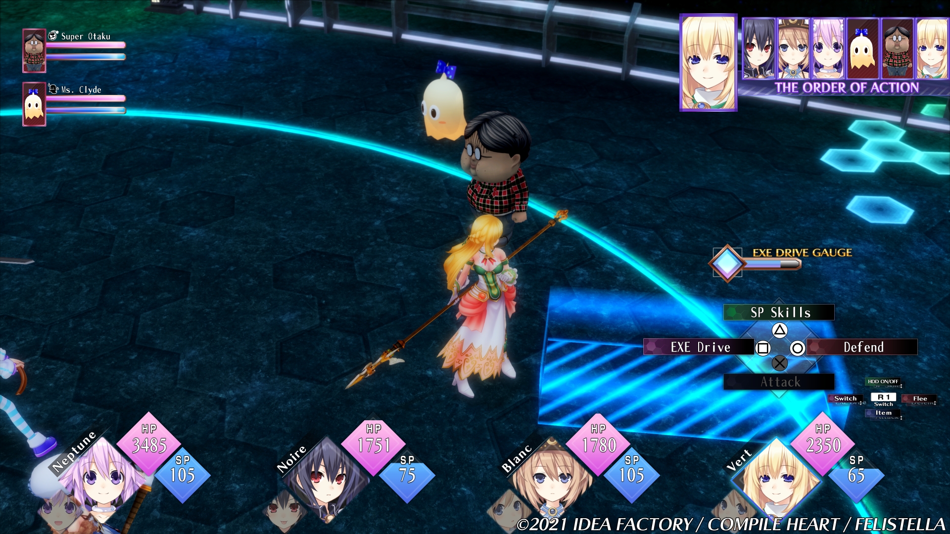 Speaking of sameness, Neptunia ReVerse plays the same way as before. The majority of the story is told through graphic novel-like panels featuring slightly animated characters and text, which are fully subtitled in English with a Japanese audio track. Some cutscenes feature English voice work as well, but most do not. These kinds of games are typically played with Japanese audio, so while it may disappoint some that the whole game wasn’t given the English audio treatment, most people will never miss it. Battles are turn-based and consist of characters moving around a circular area of the battlefield, and attacking, using an SP move, defending, or performing special EXE moves which are only available once an EXE meter has been filled. It’s a standard setup as far as JRPGs go, one that can reward a little bit of attack planning with extra damage on the enemy, but there’s not a ton of challenge to be found here.