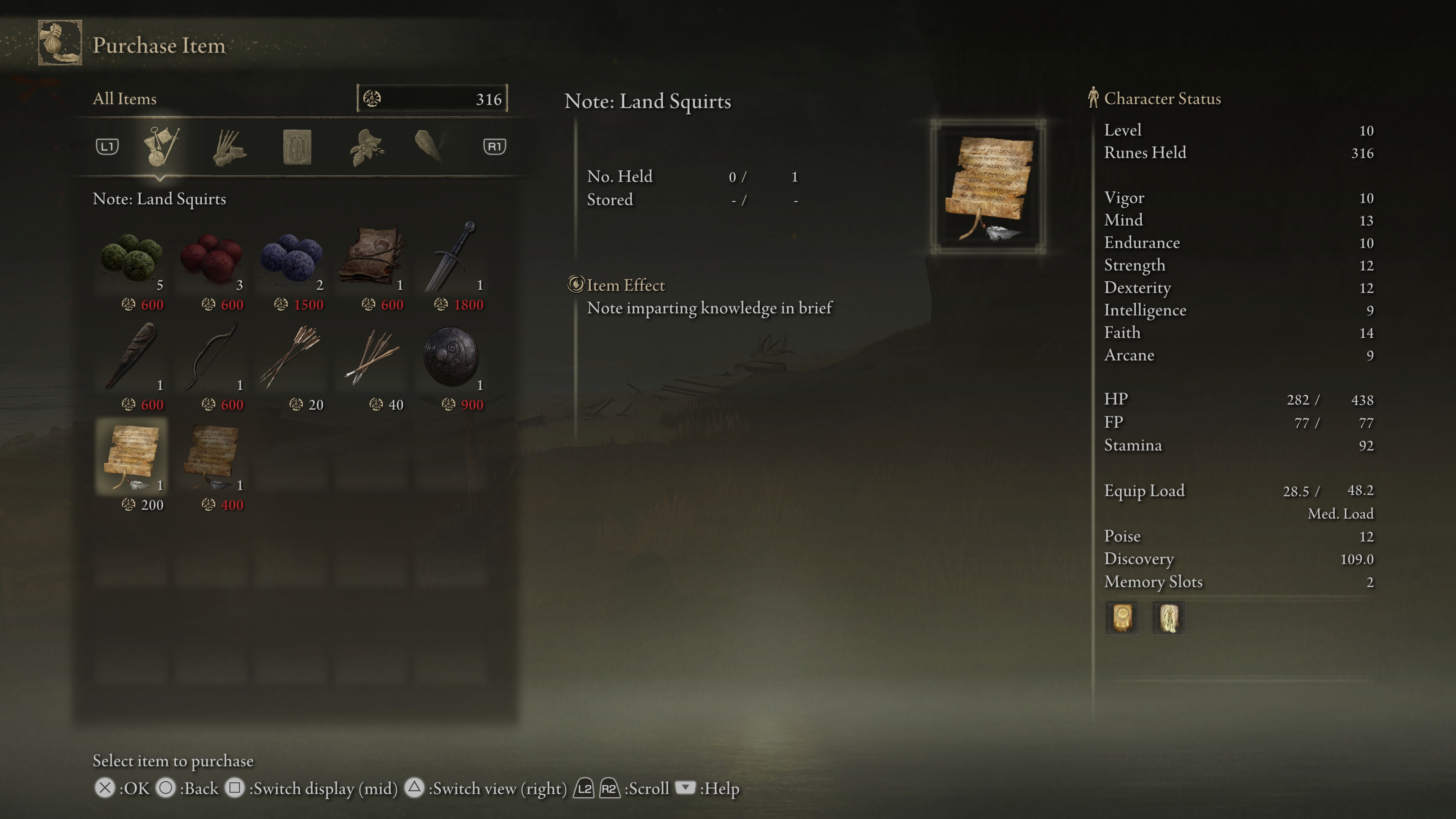Furthermore, while enemies’ difficulty level may be set in stone, there are a few options to help players along. Ashes of War are equippable skills that can be attached to most weapons, and special moves can then be executed with a press of L2, at the cost of FP. Computer-controlled allies can be summoned at certain spots, while personal spirits can also be summoned to fight alongside the player. With the right loadout, these companions can help to defeat bosses. As an example, I summoned a spirit jellyfish and was able to defeat a great beast on my second try because the jellyfish poisoned the boss which helped to hasten its demise. All of this is optional to the player, of course – the more masochistic amongst you are free to never use any of these assists, but most of us will be more than happy for the help.