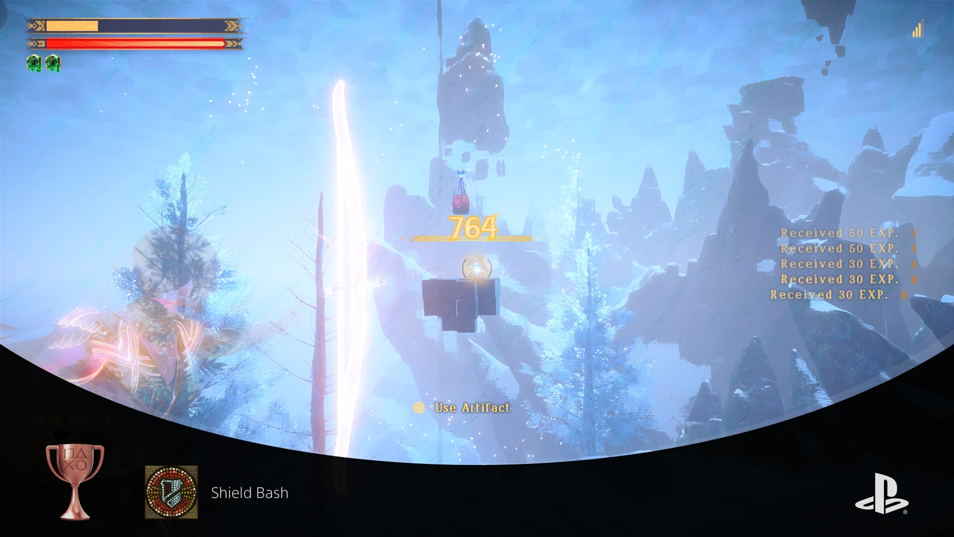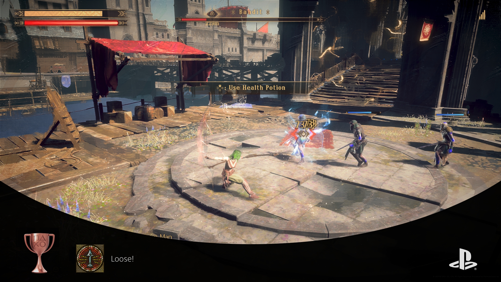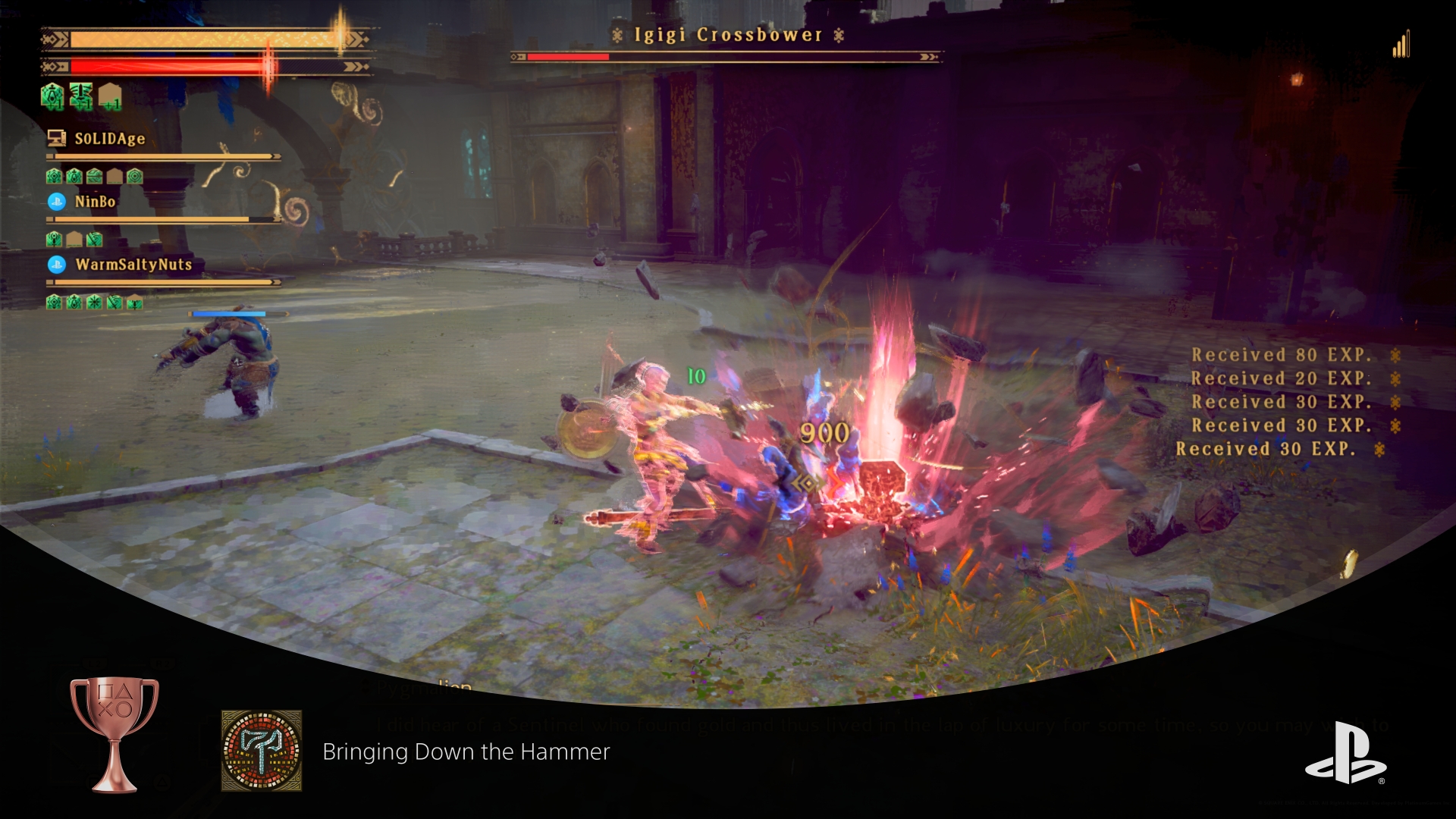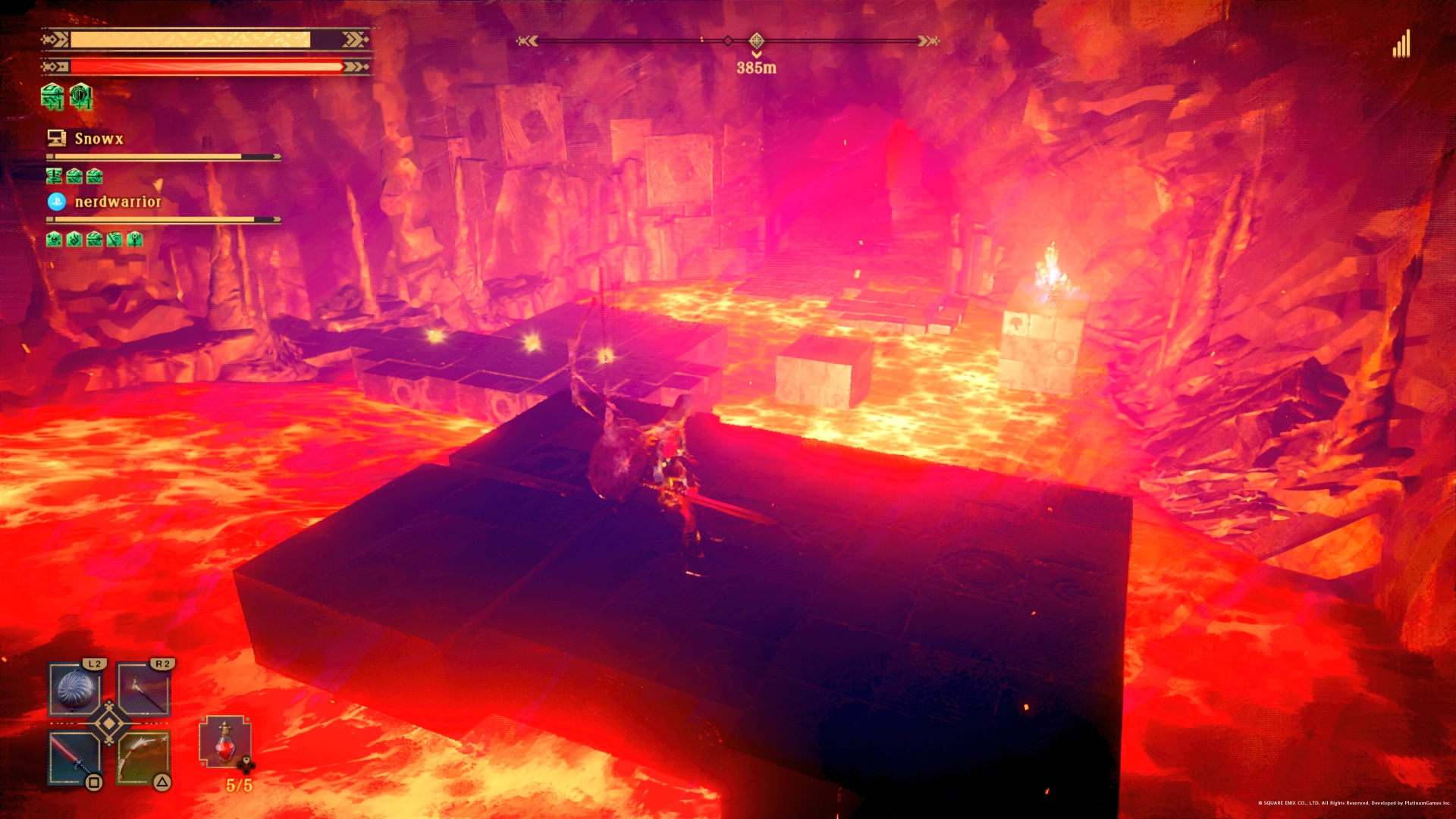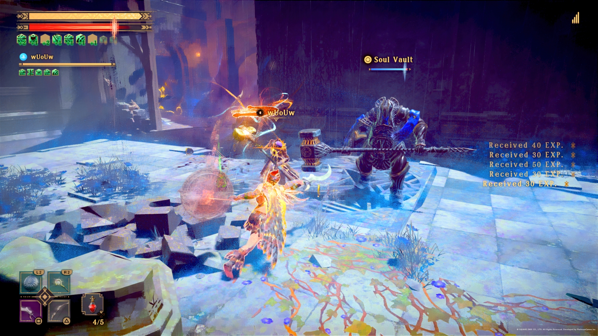 Speaking of enemies, many of them spawn in each level’s chapters, in what can feel like endless waves at times. A chapter consists of an enclosed space, where players must defeat all enemies in order to proceed. Players who are not in the area must enter it by approaching the forcefield and pressing circle – not too dissimilar than those mist fields you’ll find in a Soulsborne game. Many of these enemies are seemingly scaled with co-op in mind, since attempting to defeat them solo will be a challenge without being close to ten power levels above the recommended number. Dodging and parrying attacks are also options, which can give combat some sense of an ebb and flow like in other games.