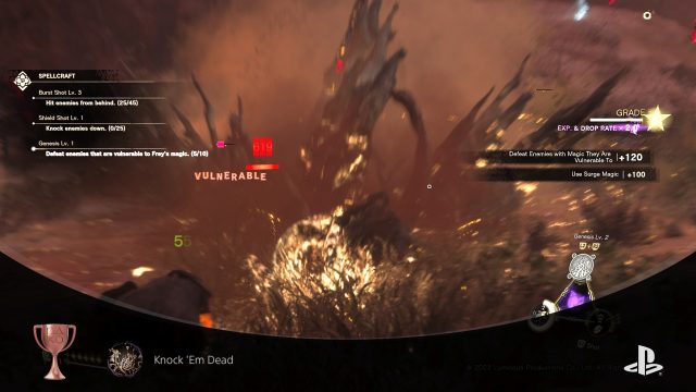 Combat is as varied as was promised during our preview last month. Frey starts out with her basic purple magic and defeating the world’s Tantas grants new magic under different colors, and wildly different fighting styles. Holding L1 allows the player to select a support magic, which as the name implies casts spells designed to help Frey along in battle. Usually, this means creating a shield or sapping health from nearby enemies, but there are also offensive support options such as laying explosive traps, spawning a flower that doubles as a turret (especially helpful against flying enemies), or creating a dome of fire that boosts your attacks whenever you’re inside it. A third type of spell called surge magic serves as Frey’s super moves, which are devastating area-damaging attacks.