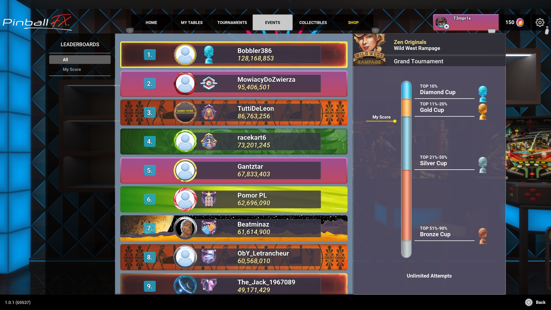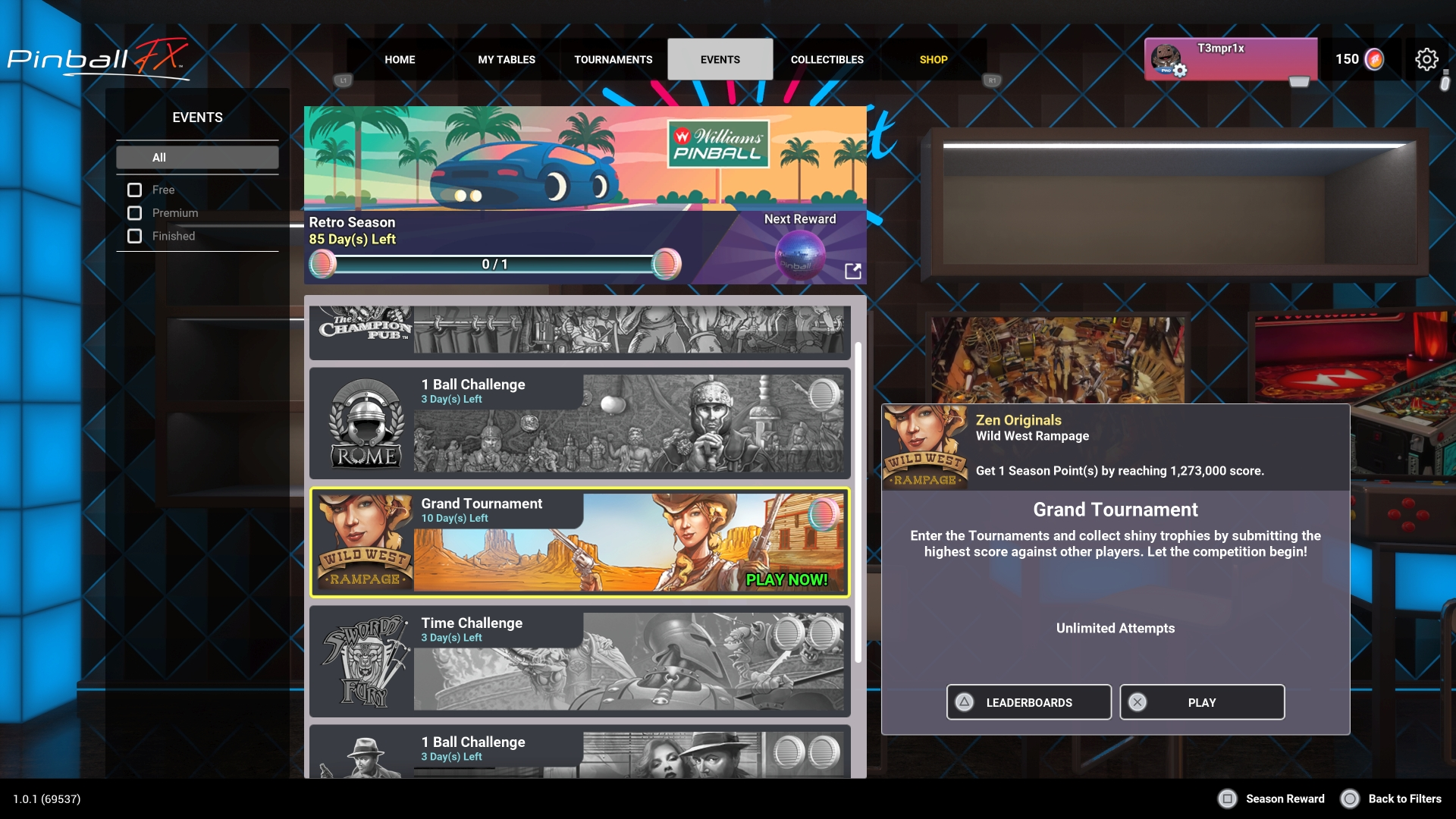 There are also a couple of online options, such as tournaments which are real-time competitive matches where everyone tries to score the most points over a limited amount of time, number of tries, or some combination thereof. You can easily create your own tournament using a table that you own in just a few steps. There is also an Events tab, which features seasonal challenges across free and premium tables. Each day, you are given a certain amount of tries to complete some objective on a table. Complete it, and you’ll be rewarded one or more coins, which are used to track progress and earn time-limited unlocks such as collectibles or items to customize your player banner.